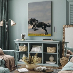 Målningen trycktes på premiumcanvas, vilket garanterar hållbarhet och färgintensitet. Dess horisontella format, som mäter 70x50 cm, är idealiskt för ett vardagsrum, kontor eller sovrum. Kontrasten mellan den svarta hästen och den ljusa bakgrunden ger kompositionen exceptionellt djup och estetik.