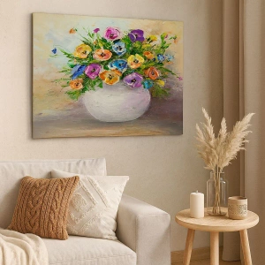 - Denna pastellfärgade canvastavla föreställer en färgglad blombukett i en vit vas. Perfekt för eleganta och romantiska interiörer.