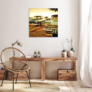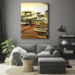Canvastavla - Bild på duk - Klassiska bilar i solnedgångens varma ljus - 70x50cm - Vi väntar och ser - Modern väggdekoration för vardagsrum och sovrum ARTTOR
