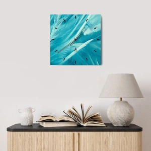 Väggklocka - Klocka på glas - Blå fjädrar i en delikat bild - 30x30cm - Drunkna i dun - Modern väggdekoration för vardagsrum, kök och sovrum ARTTOR