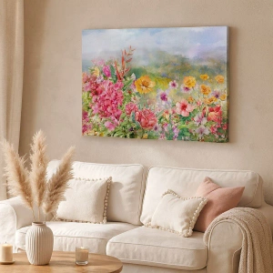 Väggkonst - Färgglad äng - En färgglad blomkomposition mot en pastellfärgad landskapsbakgrund