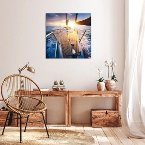 Canvastavla "Running on the waves" är en inspirerande komposition för havs- och naturälskare. Den avbildar en yacht som seglar på lugna vatten i ljuset av den nedgående solen, vilket skapar en atmosfär av harmoni och fred.