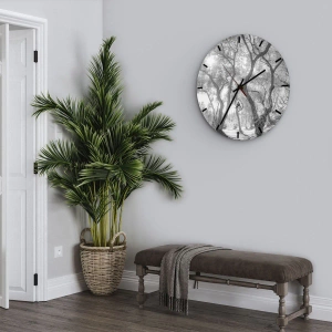Väggklocka "I en olivlund" är ett unikt dekorativt föremål som kombinerar elegans med naturen. Dess runda urtavla med en diameter på 30x30 cm har ett konstnärligt svartvitt landskap som avbildar en skogsgränd. Solens strålar som bryter igenom trädtopparna skapar en atmosfärisk bakgrund som drar till sig uppmärksamhet och uppmuntrar till reflektion. De böjda, smala trädstammarna och deras sammanflätade grenar skapar en effekt av djup och mystik. Detta motiv är idealiskt för interiörer där harmoni och tystnad värderas.