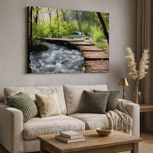 Bron leder ögat in i landskapet och symboliserar en resa och upptäckten av nya vägar. Tack vare den realistiska reproduktionen av detaljer som träets struktur eller ljusreflektioner på vattenytan, ger målningen intrycket av sann natur som transporteras in i interiören. Det är ett idealiskt val för naturälskare och ekologer.