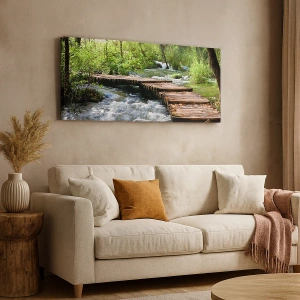 Canvastavlan "Ovanför en skummande kaskad" avbildar ett charmigt skogslandskap med en träbro över en forsande bäck. Vatten flödar dynamiskt under strukturen, vilket skapar en effekt av naturlig skönhet och frid. De omgivande gröna träden och vegetationen ger landskapet fräschör och harmoni.