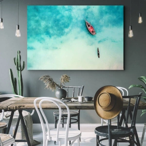 Det horisontella formatet möjliggör enkel anpassning till olika interiörarrangemang, både moderna och klassiska. Motivet med en **båt** på **turkost vatten** är inte bara en dekoration, utan också en inspiration som för tankarna till semesterstunder och exotiska resor.