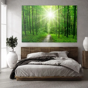 Glastavla - Bild på glas - En stig i skogen upplyst av solens strålar - 70x50cm - Grön domkyrka - Modern väggdekoration för vardagsrum och sovrum ARTTOR