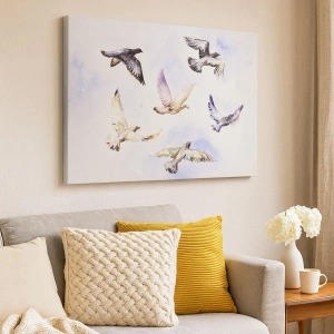 Canvastavla - Bild på duk - Akvarellfåglar i flykt mot en delikat himmel - 70x50cm - Frihet i grått och blått - Modern väggdekoration för vardagsrum och sovrum ARTTOR