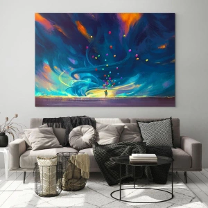 Glastavla - Bild på glas - En person som håller färgglada ballonger mot en blå vindbakgrund. - 70x50cm - Blå vind - Modern väggdekoration för vardagsrum och sovrum ARTTOR