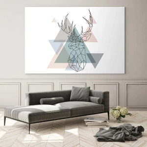 Glastavla - Bild på glas - Geometrisk teckning av en hjort mot en bakgrund av pastellfärgade trianglar - 70x50cm - I en geometrisk skog - Modern väggdekoration för vardagsrum och sovrum ARTTOR