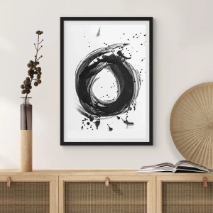 Affisch i svart ram - Svartvit abstrakt cirkel med dynamiska fläckar - 50x70cm - Skapandets virvel - Modern väggdekoration för vardagsrum och sovrum ARTTOR