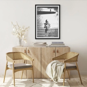 Postern "Framåt, genom staden" är ett unikt konstnärligt fotografi som drar uppmärksamhet till sig med sin enkelhet och tydlighet. Den avbildar silhuetten av en cyklist tagen mot bakgrund av ett stadsrum, där reflektionen i en vattenpöl skapar ett intressant samspel mellan symmetri och reflektion. Det svarta färgschemat framhäver kontraster och ger kompositionen en modern karaktär.