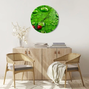 Väggklocka - Möte i grönt - Nyckelpigor på ett löv med vattendroppar