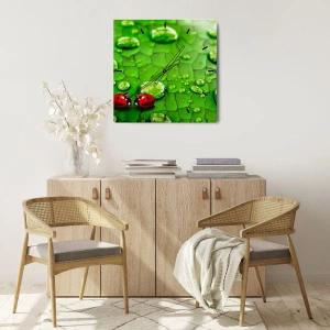 - Ett makrofotografi av nyckelpigor på ett blad täckt av vattendroppar. Ett naturligt motiv som ger fräschör och harmoni till alla interiörer.