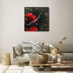 Väggklocka - Klocka på glas - Röd ros med vattendroppar på svart bakgrund - 30x30cm - Röd och svart - Modern väggdekoration för vardagsrum, kök och sovrum ARTTOR