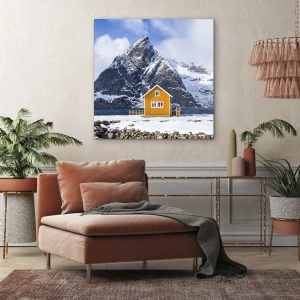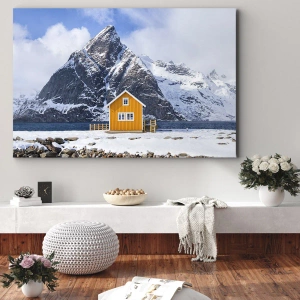 Väggkonst - Skandinaviska helgdagar - Gul stuga mot bakgrund av snötäckta berg och hav