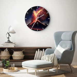 Väggklocka - Klocka på glas - Vulkanutbrott med en fontän av eld och rök mot en nattbakgrund - 30x30cm - Skönhet och skräck - Modern väggdekoration för vardagsrum, kök och sovrum ARTTOR