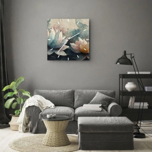 Väggklocka - Klocka på glas - Lotusblommor mot bakgrund av sjöns grönblå yta - 30x30cm - Stjärnor i en sjö - Modern väggdekoration för vardagsrum, kök och sovrum ARTTOR