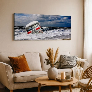 Canvastavla - Bild på duk - En sjunken buss på stranden mitt i vågor och grov sjö - 70x50cm - Förvånad? - Modern väggdekoration för vardagsrum och sovrum ARTTOR