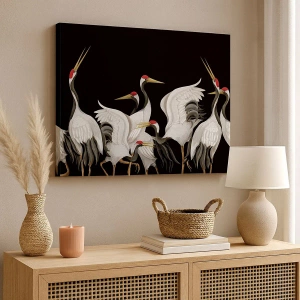 Väggkonst - Bird Matters - Vita tranor med röda accenter mot svart bakgrund