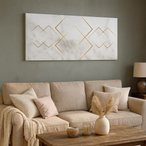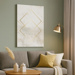 - En canvastavla med minimalistiska gyllene romber mot en vit marmorliknande bakgrund. En elegant dekorativ accessoar i modern stil som ger lyx och harmoni till alla inredningar.