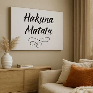 - Denna canvastavla har det inspirerande citatet "Hakuna Matata" i ett elegant typsnitt mot en vit bakgrund. Dess minimalistiska stil och universella dragningskraft kompletterar perfekt både moderna och klassiska inredningar.