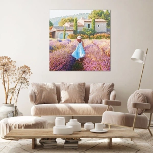 Målningen "Lavendelflicka" avbildar en pittoresk vy av en kvinna i blå klänning som går genom ett blommande lavendelfält. Denna charmiga scen utstrålar lugn och en idyllisk atmosfär och fångar perfekt atmosfären på en sommardag. I bakgrunden syns ett stenhus omgivet av grönska, vilket kompletterar målningens idylliska karaktär.