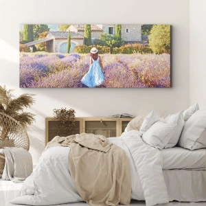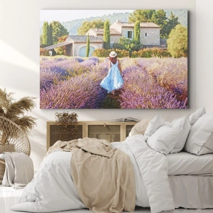 Väggkonst - Lavendelflicka - Kvinna i blå klänning som går genom ett lavendelfält med utsikt över ett hus