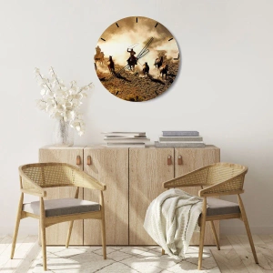 Väggklocka - Klocka på glas - Cowboys till häst i aktion mot en dammig bakgrund - 30x30cm - Verkligen vilda västern - Modern väggdekoration för vardagsrum, kök och sovrum ARTTOR