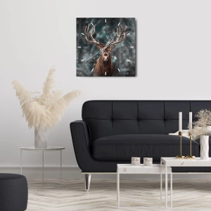 Väggklocka - Klocka på glas - En stolt hjort i en snöig skog med suddiga träd i bakgrunden - 30x30cm - Krönt skogens kung - Modern väggdekoration för vardagsrum, kök och sovrum ARTTOR