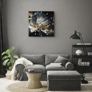 Väggklocka - Klocka på glas - En fin blomma med böljande former i guld och marinblått. - 30x30cm - Sagolik ormbunksblomma - Modern väggdekoration för vardagsrum, kök och sovrum ARTTOR
