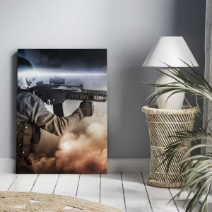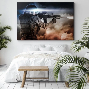 Beställ målningen "Soldat i aktion med gevär" för att ge din interiör en dynamisk och modern karaktär. Denna unika dekoration kommer att tilltala både konst- och militärentusiaster och kombinerar estetik med ett kraftfullt budskap.