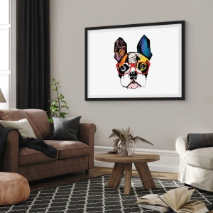 - Denna färgglada poster föreställer ett porträtt av en hund med glasögon i popkonst-stil. Den svarta inramade postern är en perfekt modern väggdekoration och ger en unik och uttrycksfull karaktär till vilken inredning som helst.