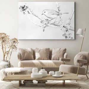 Väggkonst - Vintermorgon - Fågel på en gren i svartvitt med minimalistisk stil