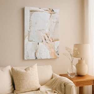 Den minimalistiska formen och de varma färgerna gör att målningen passar perfekt in i estetiken hos moderna och eleganta interiörer. Det är en dekoration som inte bara dekorerar utan också inspirerar, och introducerar en unik konstnärlig accent i rummet. Det perfekta valet för ett vardagsrum, sovrum eller vilket utrymme som helst där vi vill betona en atmosfär av lugn och reflektion.