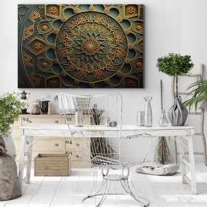 - Denna canvastavla på 70x50 cm avbildar en guldfärgad mandala mot en turkos bakgrund med rika detaljer. Ett perfekt val för eleganta och stilfulla inredningar.