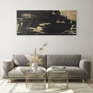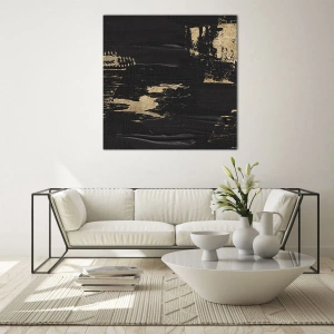Målningens minimalistiska, men ändå uttrycksfulla form gör den till mittpunkten i alla arrangemang. Färgschemat, baserat på klassiskt svart och metalliskt guld, passar perfekt in i interiörer i en glamorös, modern, loft och till och med industriell stil.