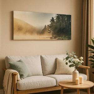 Väggkonst - Dagens födelse - Dimmig skog vid en lugn sjö