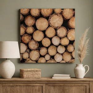 - Denna målning avbildar högar av fällda trädstammar arrangerade i harmoni. Denna minimalistiska komposition i naturliga färger kompletterar perfekt både moderna och rustika interiörer.