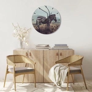 - Denna väggklocka med en diameter på 30 cm har ett zebramotiv i en naturlig savannmiljö. Perfekt för naturälskare och minimalister.