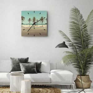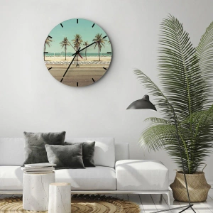 Väggklocka "På stranden" - Palmer och en strand med en promenad vid det turkosa havet