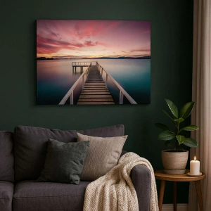 - Denna charmiga canvastavla på 70x50 cm visar en brygga som leder till en lugn sjö i solnedgången. Perfekt för inomhusmiljöer, den skapar harmoni och lugn.