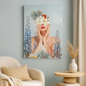 Blommor symboliserar skönhet och delikatess, och det uttrycksfulla porträttet av en kvinna ger elegans och karaktär till hela kompositionen. Detaljer, som blommornas intensiva färger och ansiktets subtila linjer, ger målningen djup och uttrycksfullhet, vilket gör den till ett idealiskt val för dem som uppskattar sofistikerade väggdekorationer.