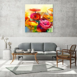 Blommotivet livar upp rummet, introducerar en vårstämning och ger väggarna en unik karaktär. Bilden utmärker sig genom sin höga kvalitet på hantverket tack vare glasytan, som betonar färgdjupet och ger glans.