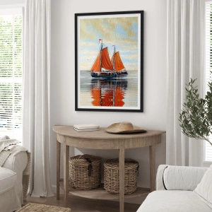 Posterns nautiska tema återspeglar naturens lugn och skönhet och skapar ett unikt dekorativt element. Röda segel ger uttrycksfullhet, medan subtila reflektioner i vattnet betonar bildens konstnärliga karaktär.