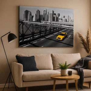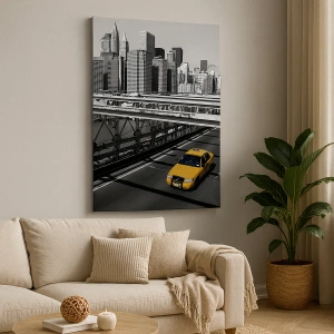 Denna ARTTOR-canvastavla med titeln "Stadens färg" visar en distinkt vy över New York med en gul taxi som korsar bron. Det svartvita stadslandskapet med en distinkt färgaccent skapar en unik atmosfär av urban elegans. Det är ett perfekt val för dem som värdesätter modernitet och urban stil.