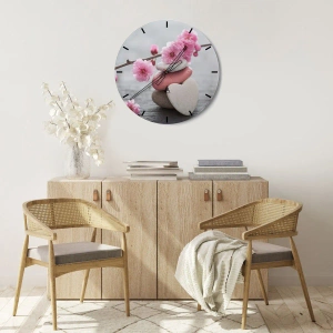 - En väggklocka med ett motiv av rosa körsbärsblommor på en gren, arrangerad bredvid dekorativa stenar i pastellfärger. Perfekt för zen-inredning och minimalistiska arrangemang.