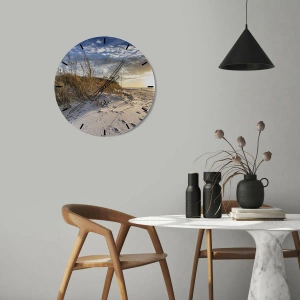 Väggklockan "Inbjudan till en promenad" har en unik design som tar dig direkt till sanddynerna vid havet. Den erbjuder en pittoresk utsikt över stranden dekorerad med fina gräs i solnedgångens gyllene ljus. Denna komposition återspeglar kustens lugn och naturliga skönhet.