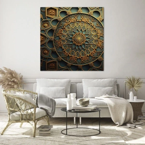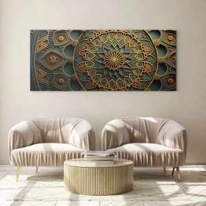 Glastavla - Bild på glas - Guld- och turkosprydnad i stil med en arabisk mosaik - 70x50cm - I ett arabiskt klimat - Modern väggdekoration för vardagsrum och sovrum ARTTOR