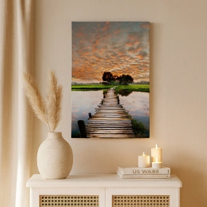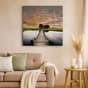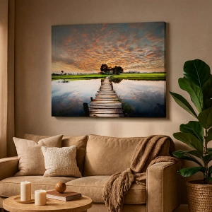 Duken är uppspänd i ramen. Sidor och kanter är täckta med tryck och skapar en fortsättning av bilden. Bilden är klar att hängas på väggen. Varje produkt har en ögla som är fastsatt i ramen samt en monteringssats (skruv + plugg).